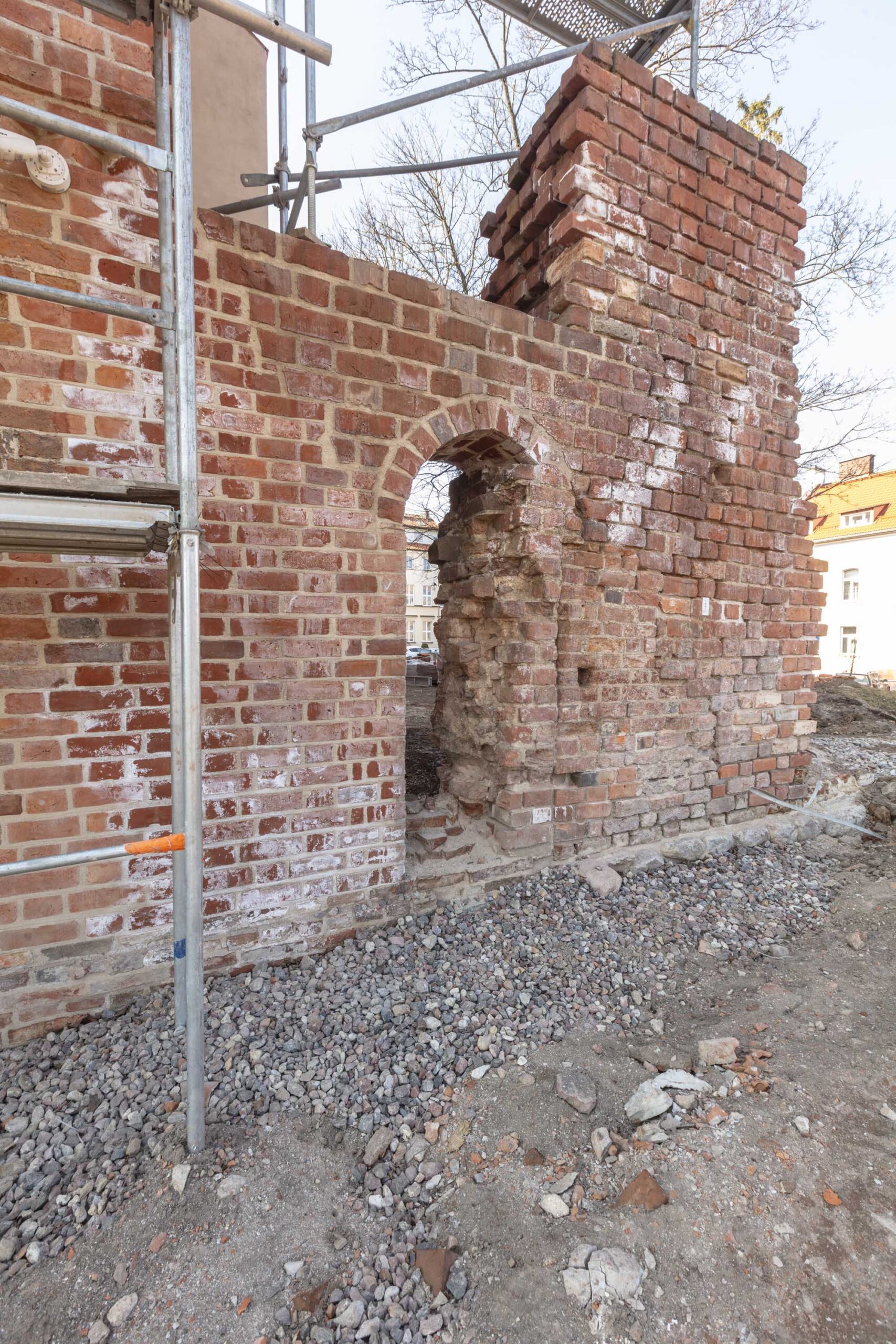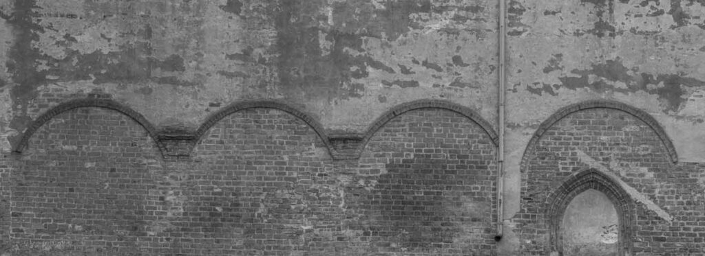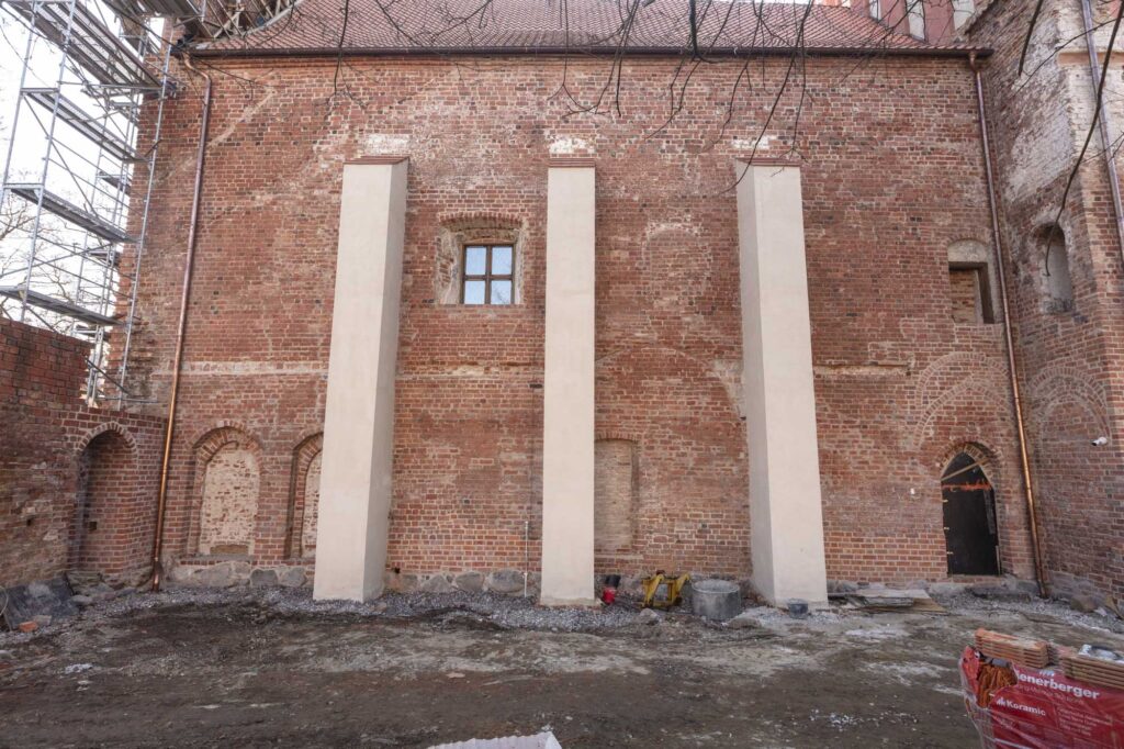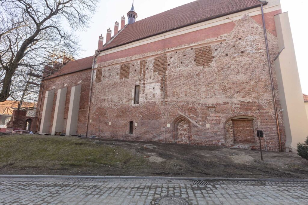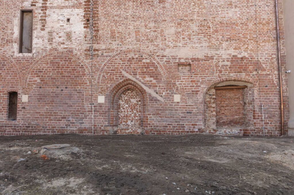 Teraz możemy spojrzeć w kierunku elewacji północnej prezbiterium. W XV w. była ona odsłonięta tylko w pasie ok. 2 m poniżej okapu. Do dziś widać nieregularną dekorację z zendrówek użytych do wymurowania najwyższej części ściany. Niższa część była zasłonięta przez skrzydło wschodnie i dostawioną do niej gotycką zakrystię – do kościoła prowadziły aż trzy portale. Wschodni portal (10) pierwotnie służył nie zakonnikom ale mieszczanom zapewniając przejście przez kościół pod murem obronnym. Po rozbudowie kościoła i klasztoru po 1414 r. komunikacja ta straciła znaczenie militarne.
