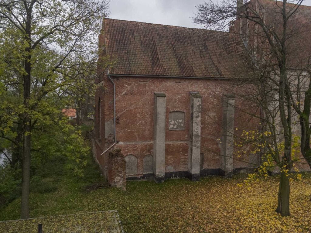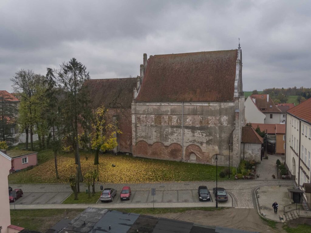 Przekształcenia założenia z przełomu XVI i XVII w. spowodowały, że elewację w całości zasłoniły budynki klasztorne. Istotne zmiany wprowadzono też w poł. XVIII w. podczas przebudowy klasztoru – dodano wówczas nowy portal wejściowy na osi krużganka (14), zlikwidowano przejścia z dawnej gotyckiej zakrystii (11), a na piętrze – w bibliotece – wykonano dwa przeźrocza, zapewniające wgląd do prezbiterium (15,16). Zapraszamy teraz na wycieczkę poza mury obronne Barczewa, w kierunku rzeki Pisy, by móc spojrzeć na wschodnią elewacje kościoła wspartą na fortyfikacjach miasta.