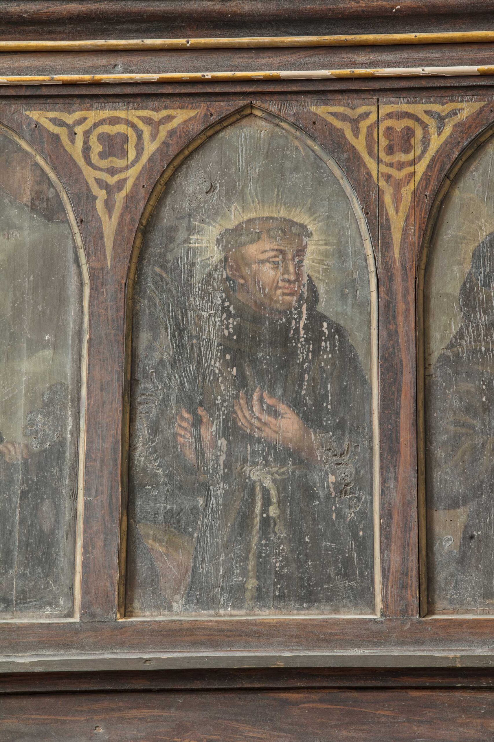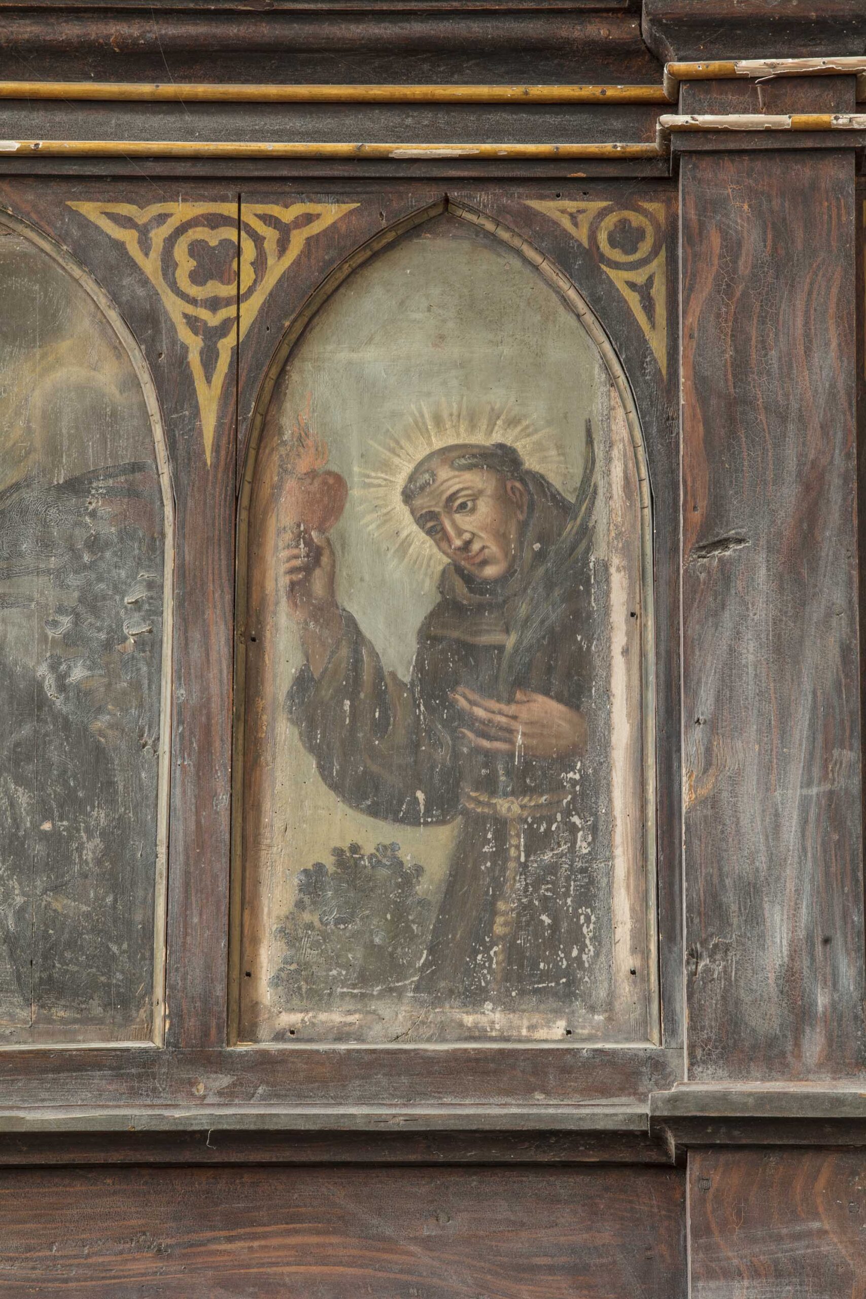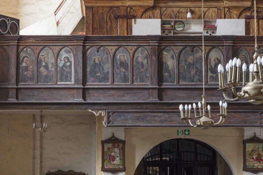 Odwracając się za siebie w stronę elewacji zachodniej kościoła widzimy polichromowaną emporę z wizerunkami świętych franciszkańskich.