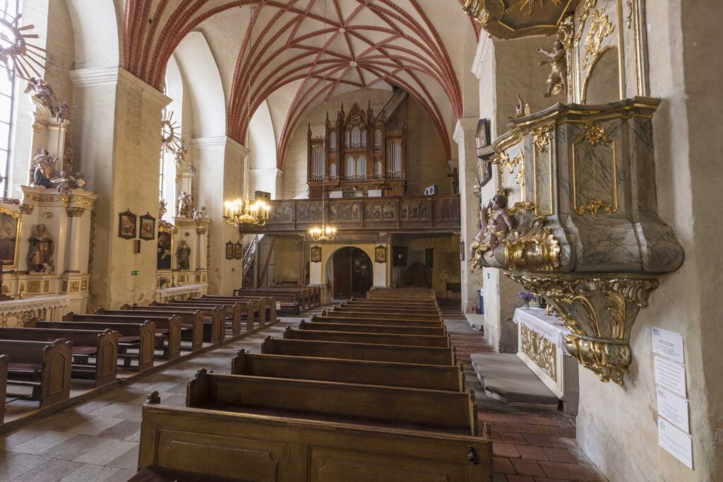 W XIX w. po kasacie klasztoru i zamurowaniu wszystkich przejść między kościołem a klasztorem, konieczne stało się zapewnienie wejścia na emporę organową i poddasze. Z tego powodu dodano wówczas drewniane schody drabiniaste zachowane do dziś. Na emporze stoi nowy neogotycki, prospekt organowy wykonany dopiero w końcu XIX w.