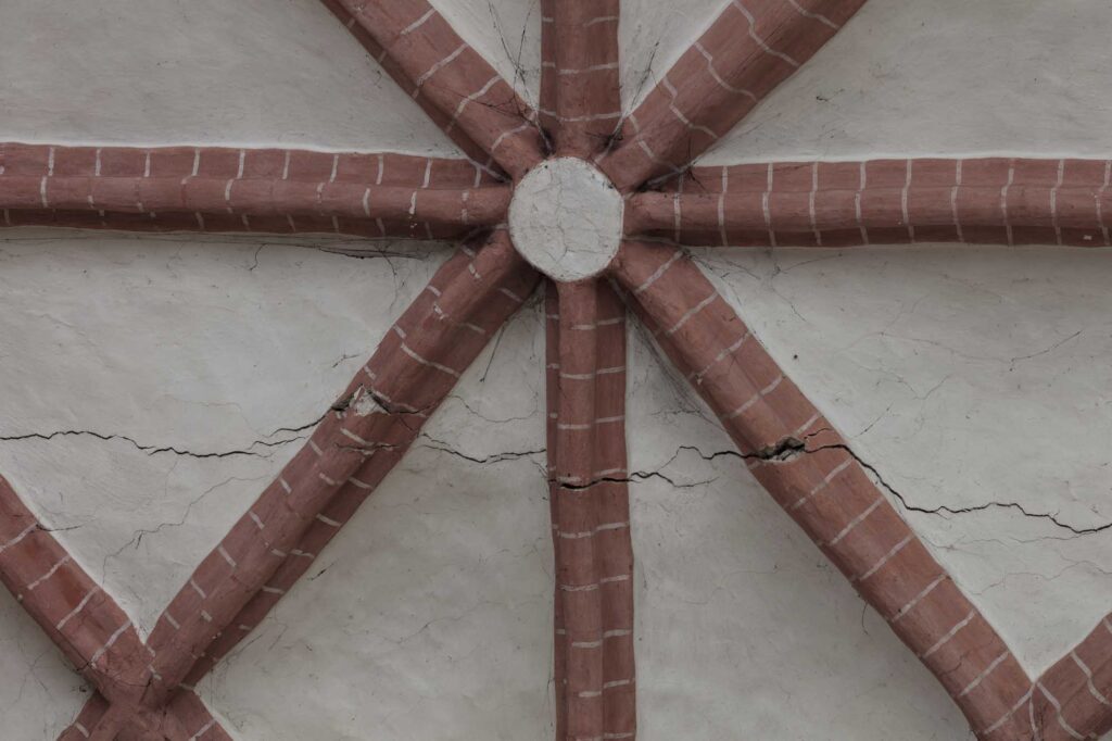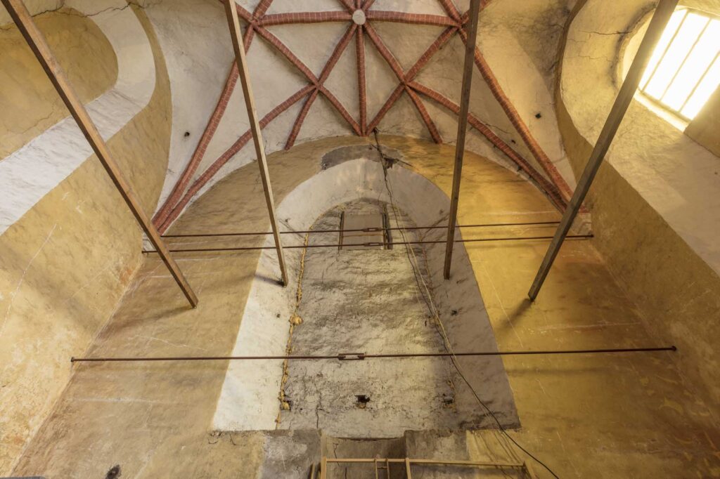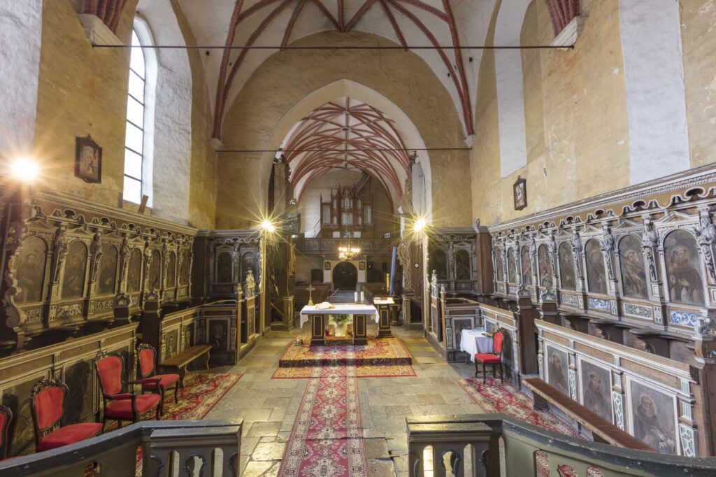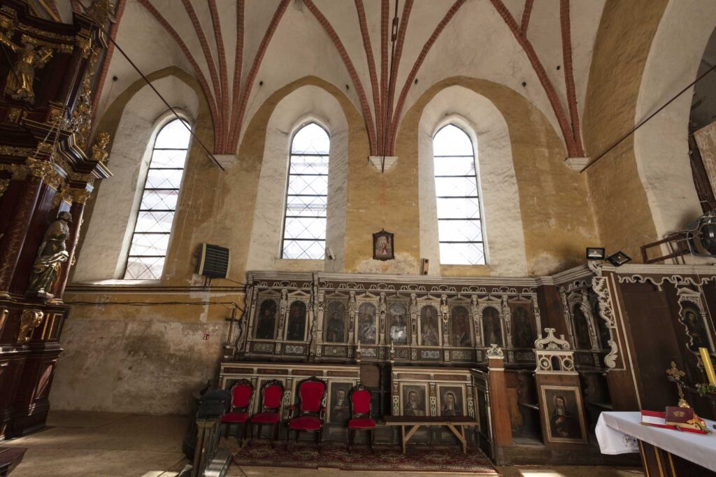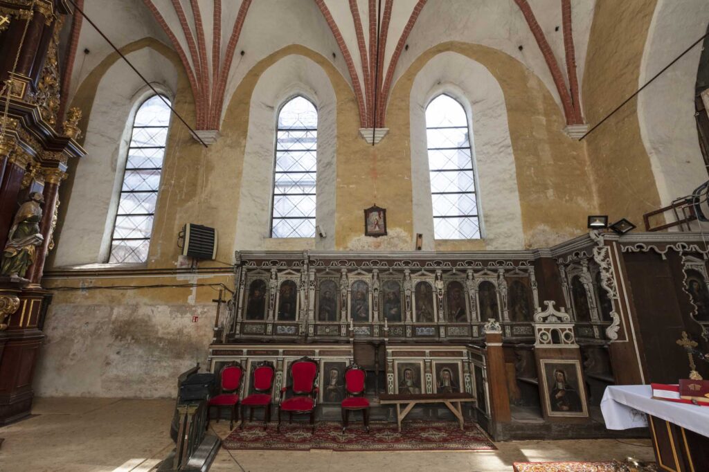 Zapraszamy teraz do prezbiterium świątyni. Jest to najstarsza część kościoła. Pierwszy murowany budynek obejmujący trzy zachodnie z czterech przęseł obecnego chóru powstał już ok. 1370 r. Strzępia pierwotnej ściany wschodniej i zmiany w konstrukcji fundamentów zostały odkryte między dwoma portalami widocznymi w północno-wschodnim narożniku kościoła z lewej strony ołtarza głównego. Zagłębienie przy tych portalach pokazuje średniowieczny poziom posadzki prezbiterium. Pod koniec XIV w. kościół został przedłużony w kierunku wschodnim i nadbudowany na mur obronny miasta.