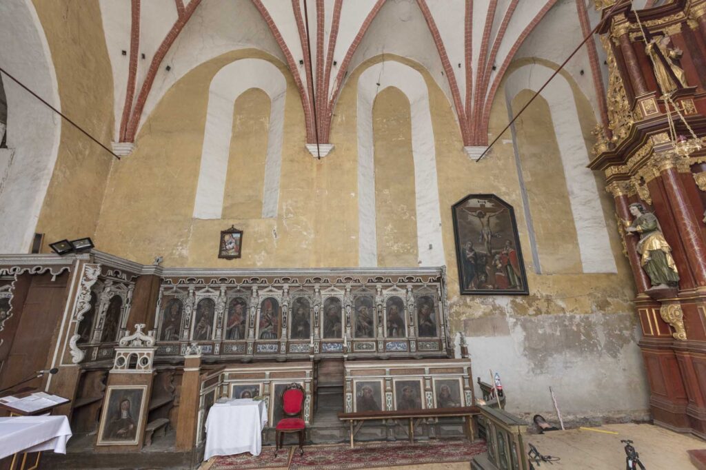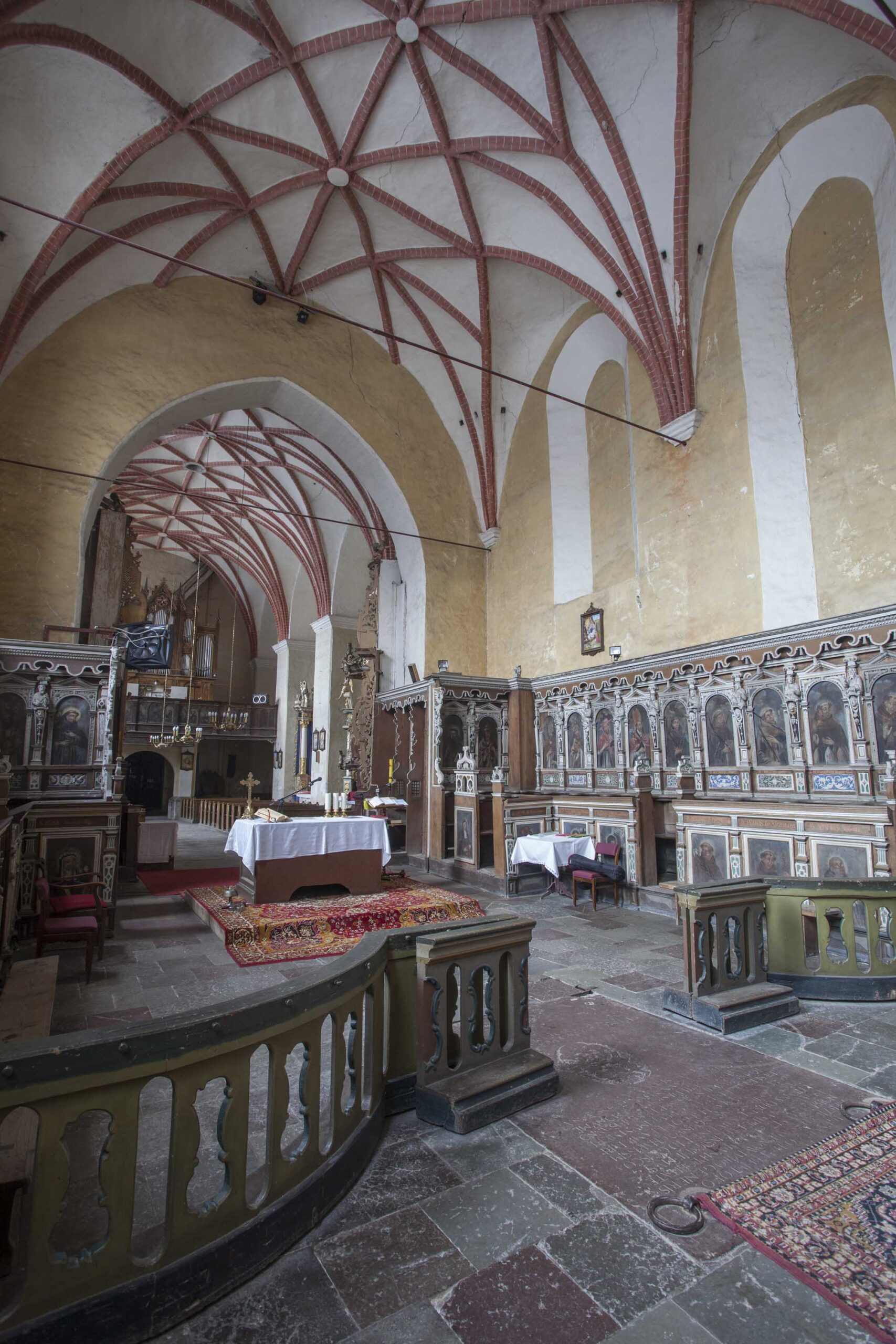 Od początku zakładano wybudowanie w części zachodniej prezbiterium lektorium czego dowodzą pozostawione tam przejścia. Ostatecznie drewniana przegroda chórowa powstała w XV w., po dostawieniu korpusu nawowego. Mimo pożarów kościoła i jego gruntownej przebudowy na przełomie XVI i XVII w. w manierystycznym wystroju świątyni początkowo utrzymano chór zachodni, a nad prezbiterium założono sklepienie kolebkowe, podobnie jak w przypadku nawy imitujące późnogotyckie sieciowo-gwieździste. W pierwszej dekadzie XVII w wystawiono manierystyczne stalle, a konsekracja odbudowanej świątyni nastąpiła w 1610 r..