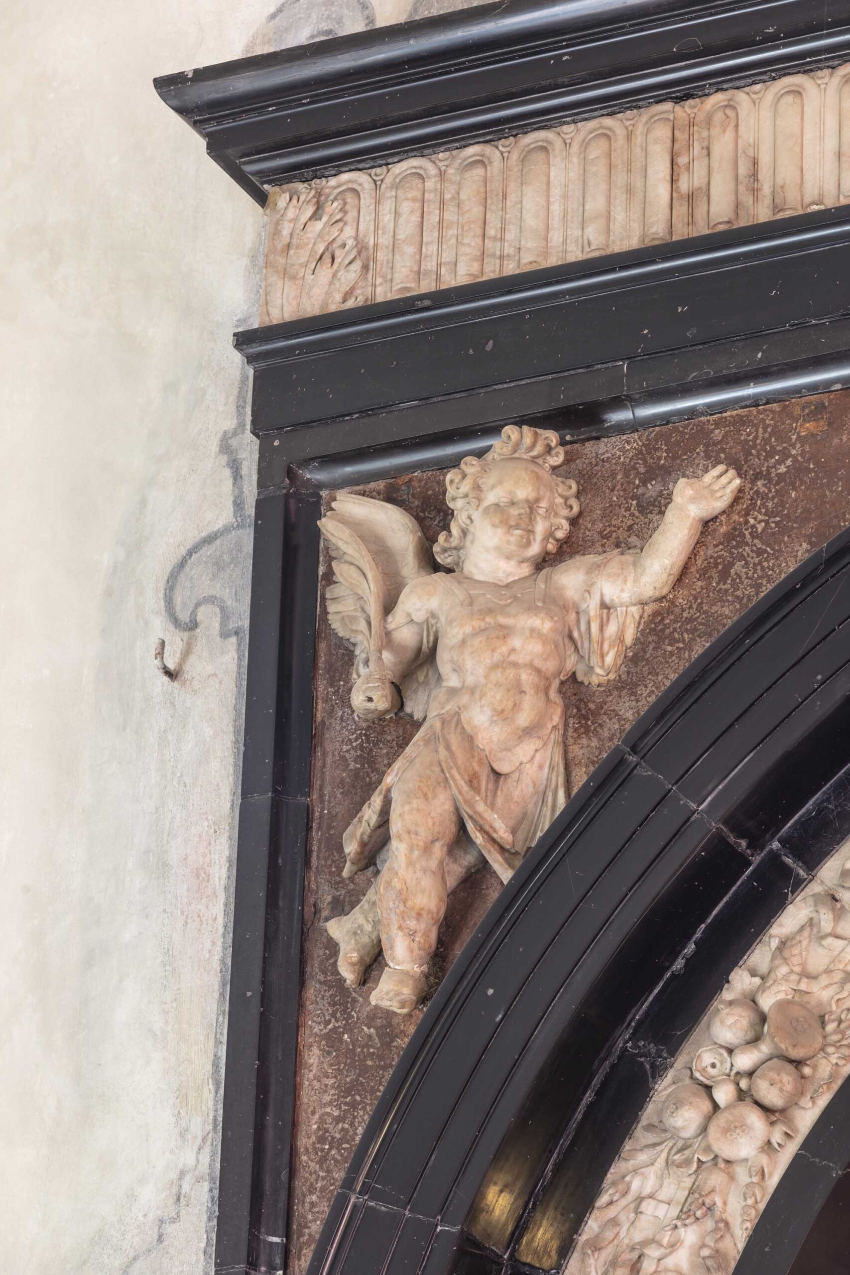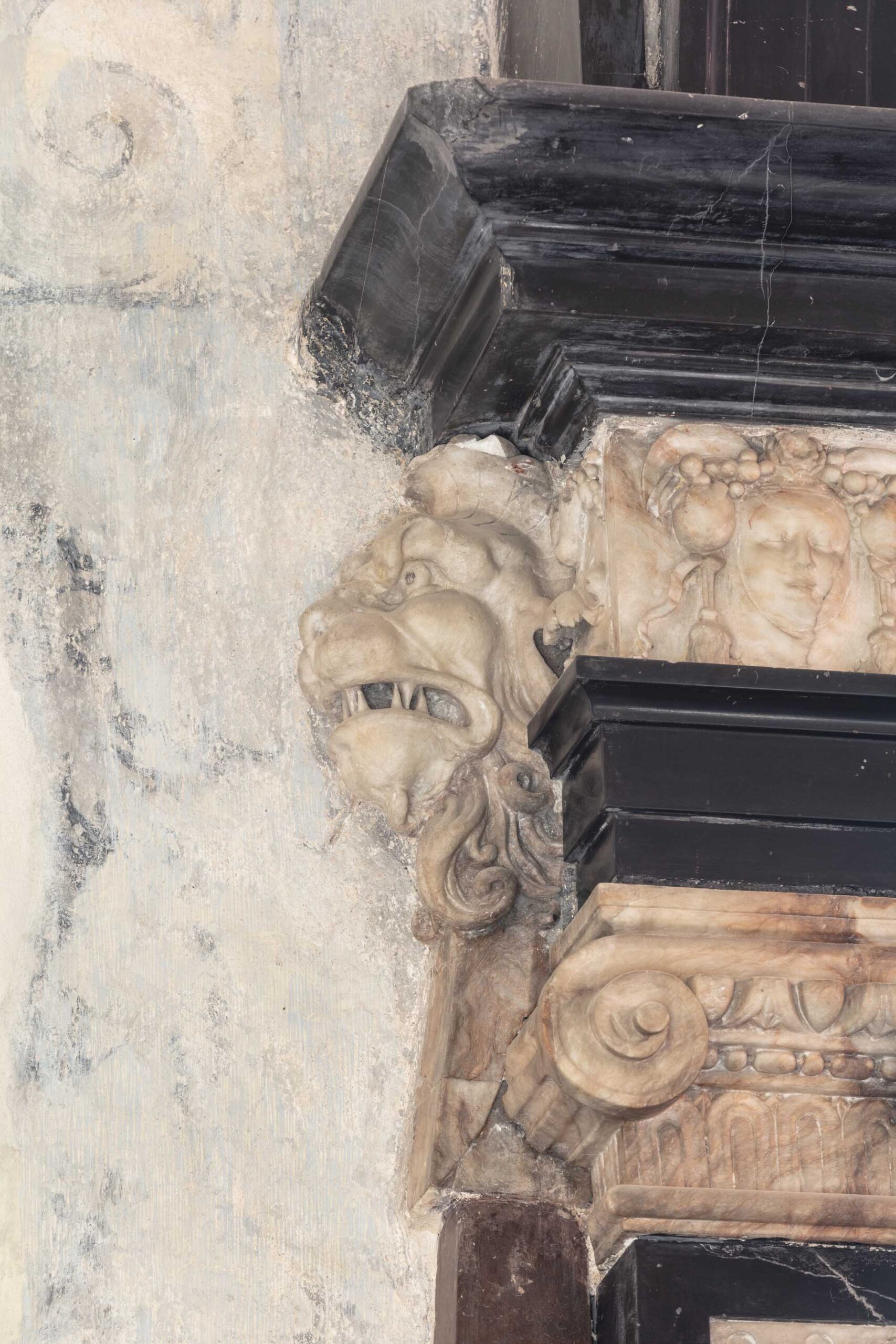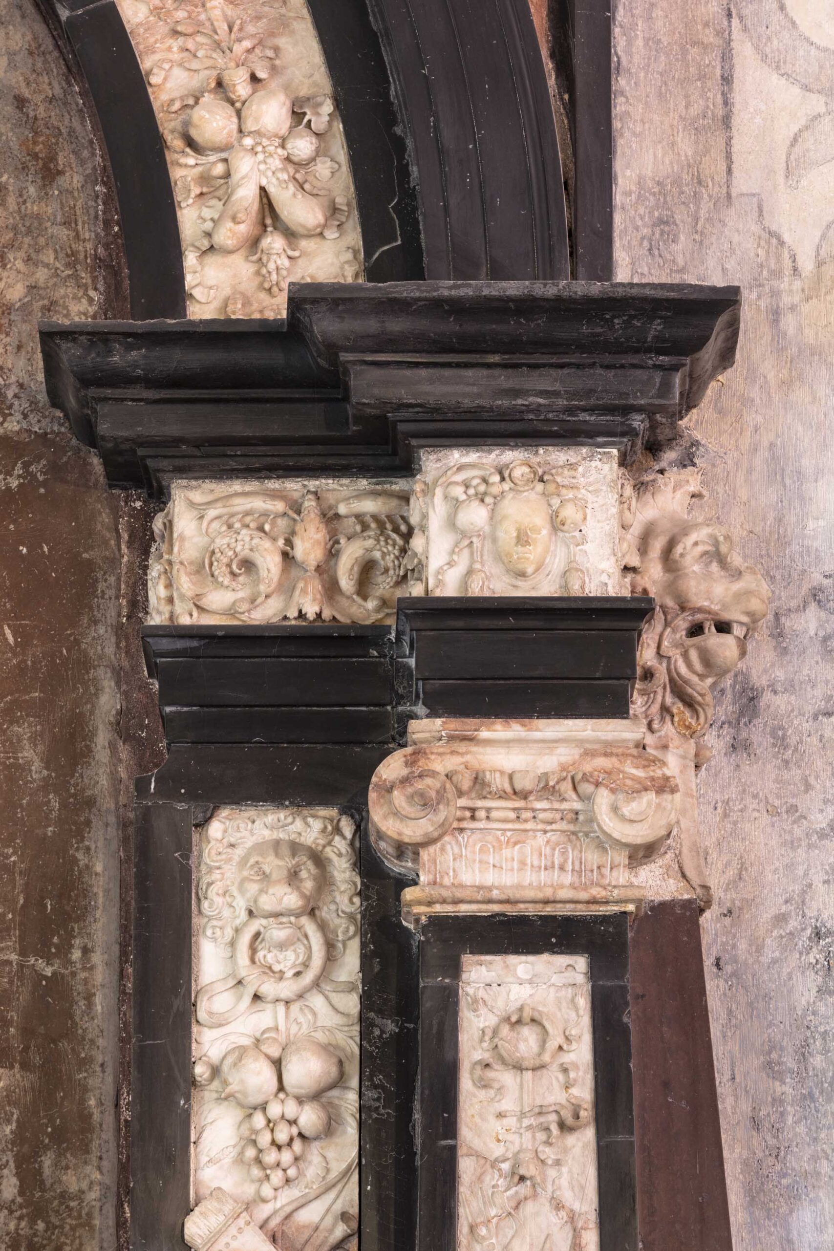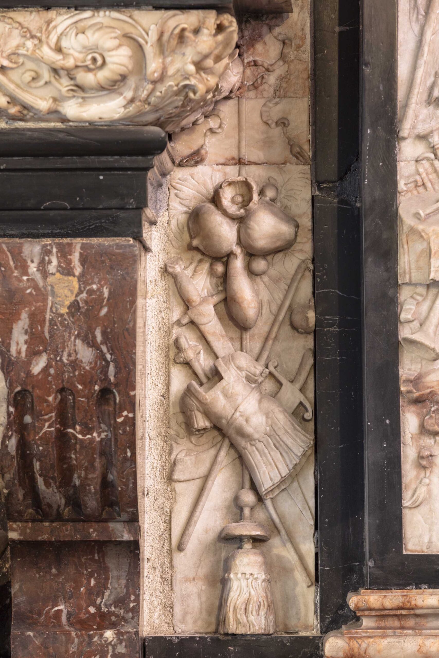 Twórcą nagrobka jest osiadły w Gdańsku flamandzki architekt i rzeźbiarz Willem van den Blocke [czyt. wilem wan den bloke]. Należał on do najwybitniejszych mistrzów dłuta, działających w Rzeczypospolitej na przełomie XVI i XVII w. Na zlecenie króla Stefana Batorego wykonał w Siedmiogrodzie nagrobek jego brata – Zygmunta, a dla niego samego zaprojektował koronę. Kolejny polski władca, Zygmunt III Waza, zamówił u Willema van den Blocke nagrobek swojego ojca Jana III Wazy, znajdujący się obecnie w Szwecji, w katedrze w Uppsali. Wykonany w stylu manieryzmu niderlandzkiego nagrobek Batorych został ukończony w 1598 roku. Po zmontowaniu kamiennych elementów architektonicznych, rzeźb figuralnych i detali ornamentalnych, dzieło zostało wzbogacone o malowane na ścianie ornamenty z motywem smoczych głów.