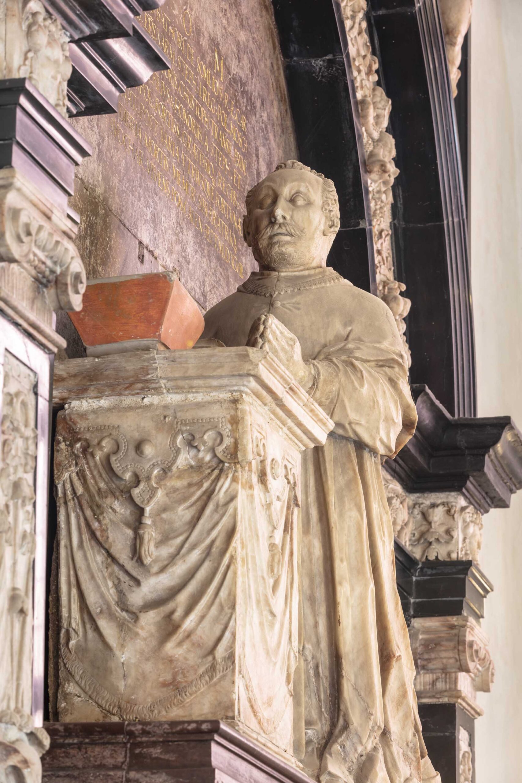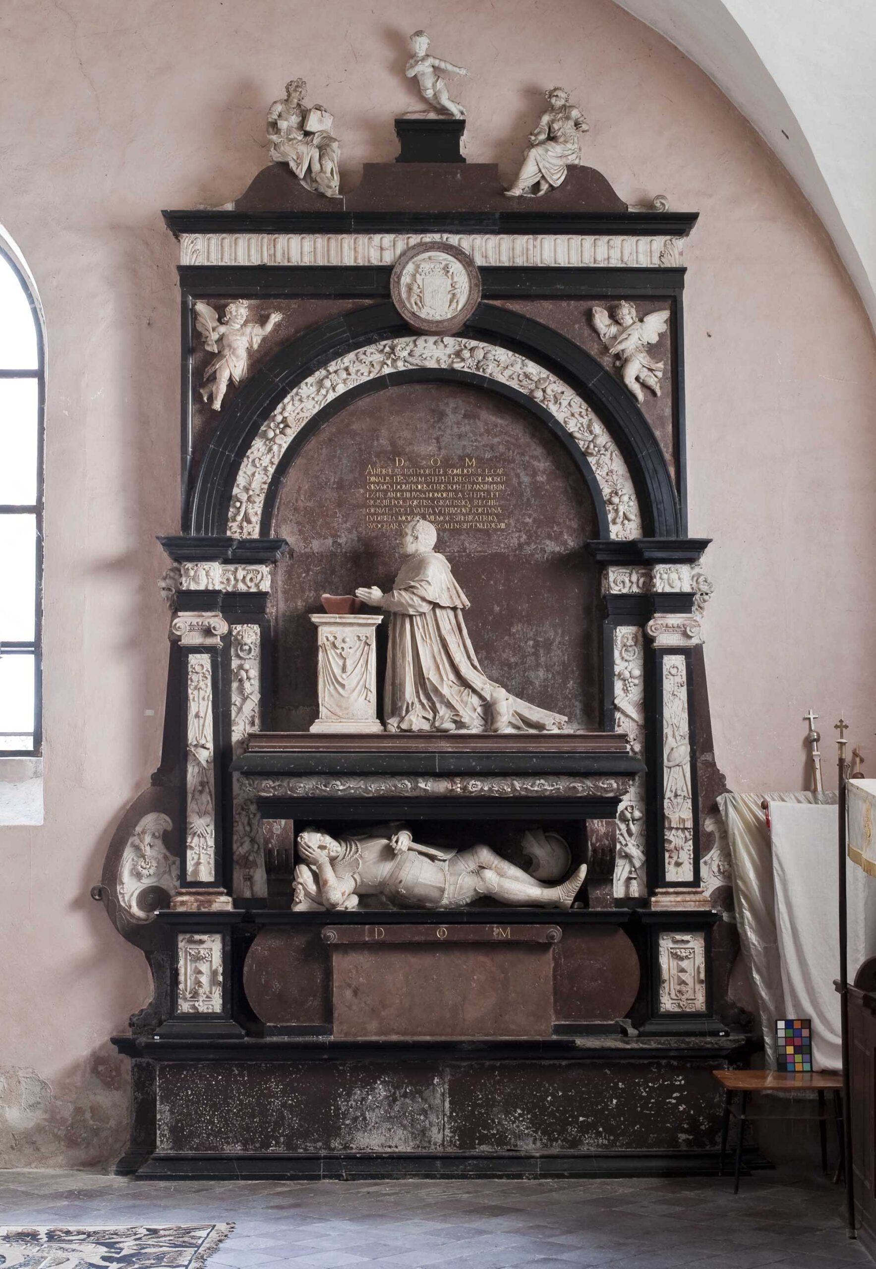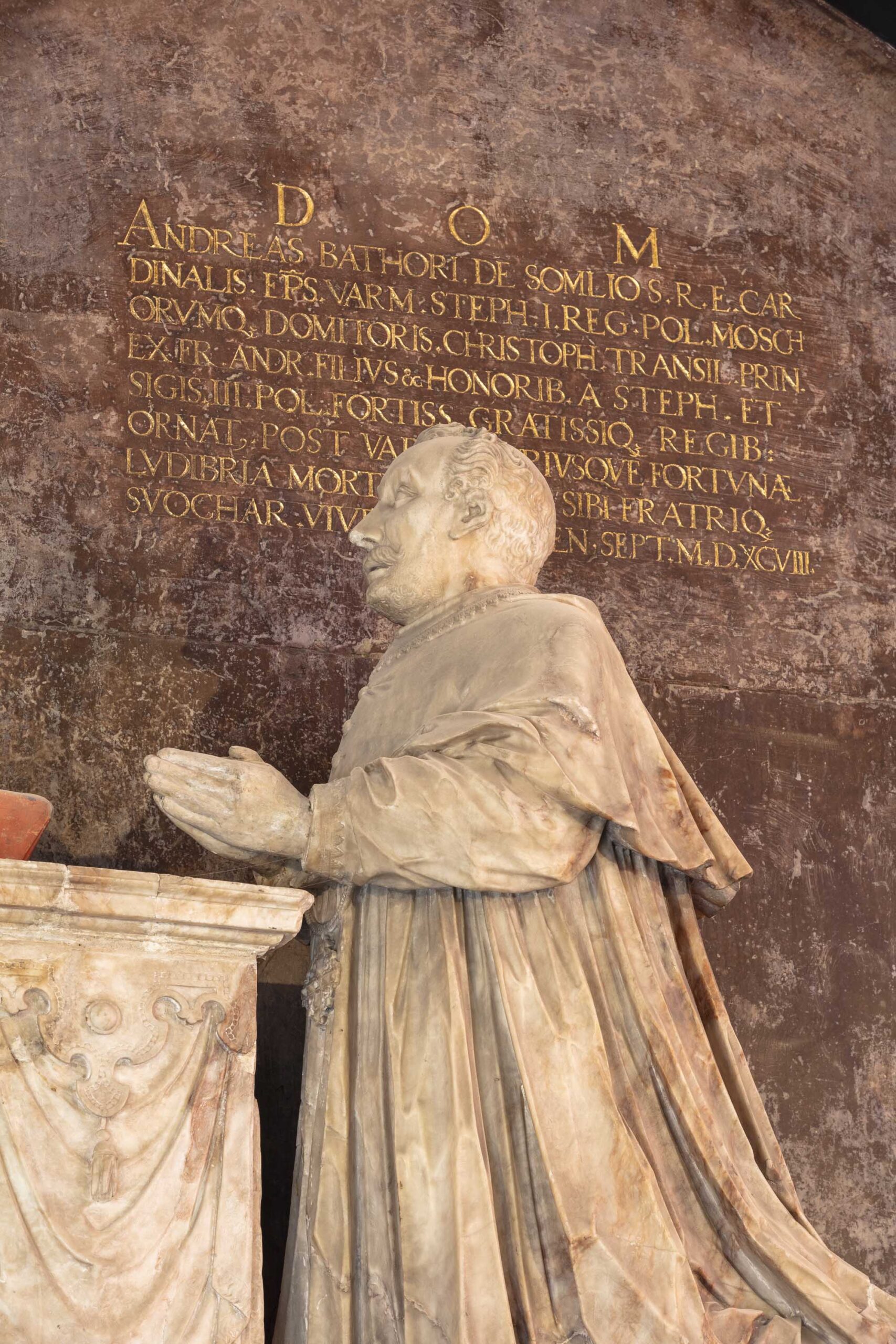 Fundatorem nagrobka w Barczewie był Andrzej Batory, książę Siedmiogrodu, bratanek Stefana Batorego. Dzięki poparciu koronowanego stryja zdobył on wykształcenie w Rzeczypospolitej oraz w Rzymie i otrzymywał co raz wyższe godności kościelne. Mimo że pełnił funkcję biskupa warmińskiego, a w wieku 21 lat otrzymał tytuł kardynała, nie miał święceń kapłańskich, co stosunkowo często zdarzało się w dawnej Rzeczypospolitej. Z inicjatywy Andrzeja Batorego w opuszczonym przez Franciszkanów klasztorze w Barczewie osiedli Bernardyni. Tutejszą kaplicę św. Antoniego kardynał wybrał na miejsce spoczynku dla siebie i swojego brata Baltazara. Żaden z nich nie spoczął jednak w krypcie, obaj padli ofiarą walk o władzę w Siiedmiogrodzie. Wyobrażony w dolnej części nagrobka w rycerskiej zbroi Baltazar Batory zginął w 1594 roku z rozkazu swojego kuzyna Zygmunta Batorego. Ukazany powyżej w szatach kardynalskich Andrzej Batory został pokonany w bitwie pod Sibinem przez hospodara Mołdawskiego Michała Walecznego. W czasie ucieczki do Mołdawii Andrzej Batory został schwytany i zabity przez chłopów szeklerskich, a jego odcięta głowa została ofiarowana hospodarowi. Papież Klemens VIII obłożył klątwą wieś, z której pochodzili oprawcy polskiego kardynała, nakazując jej mieszkańcom stuletni post w ramach pokuty.