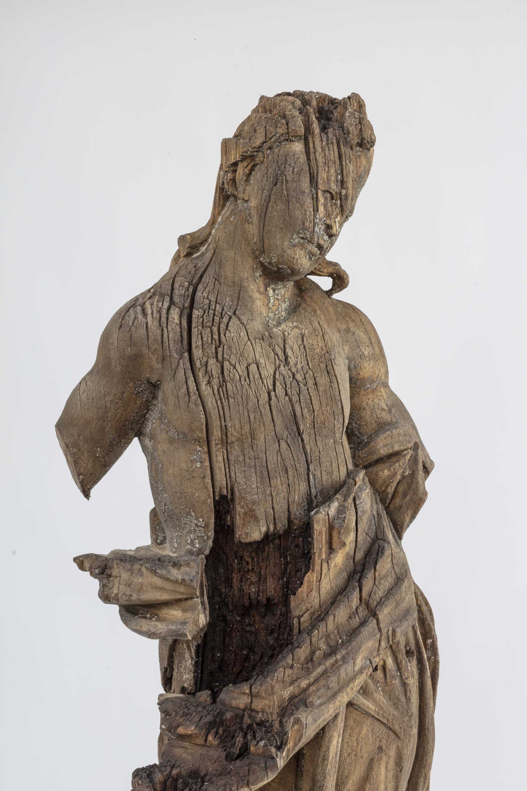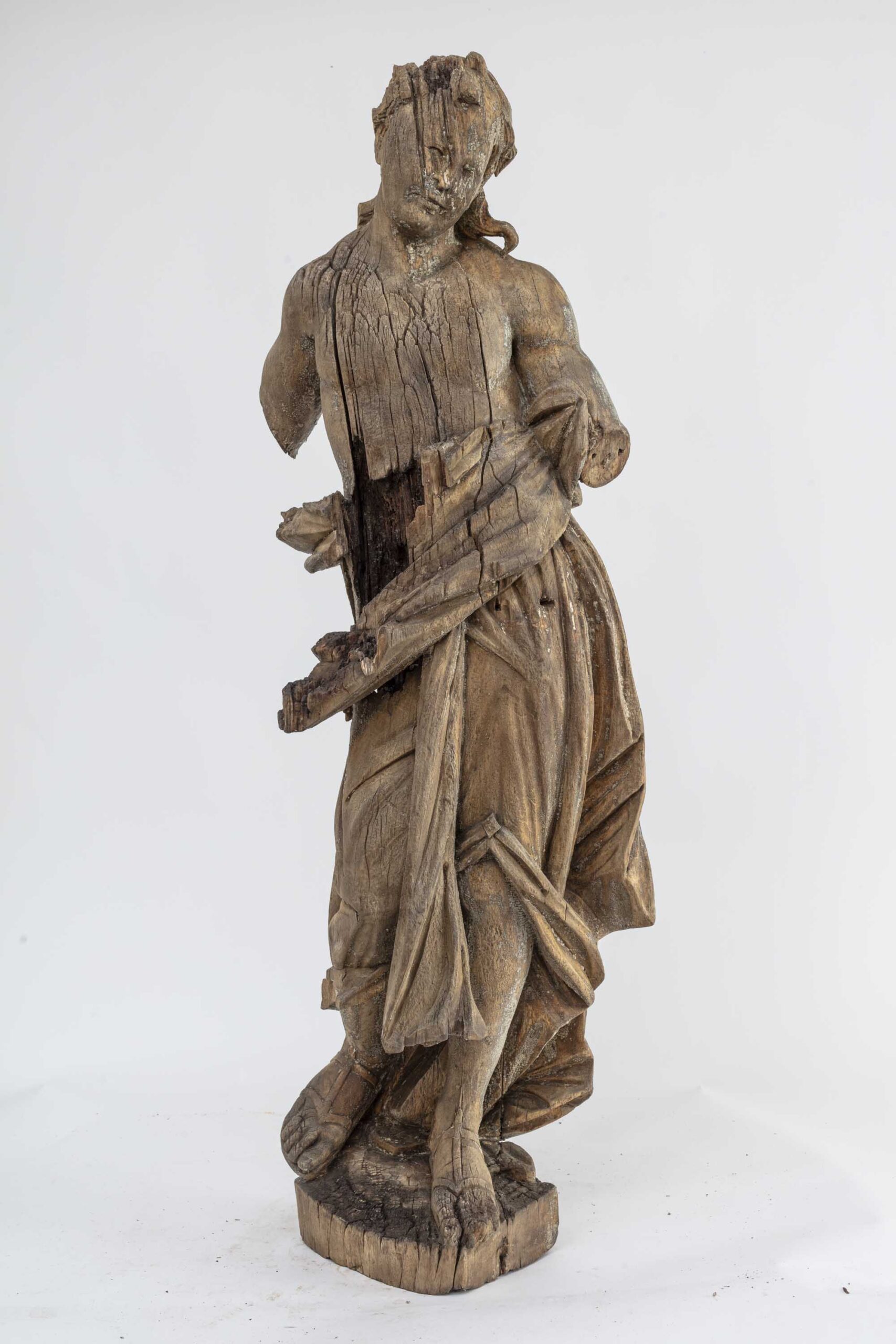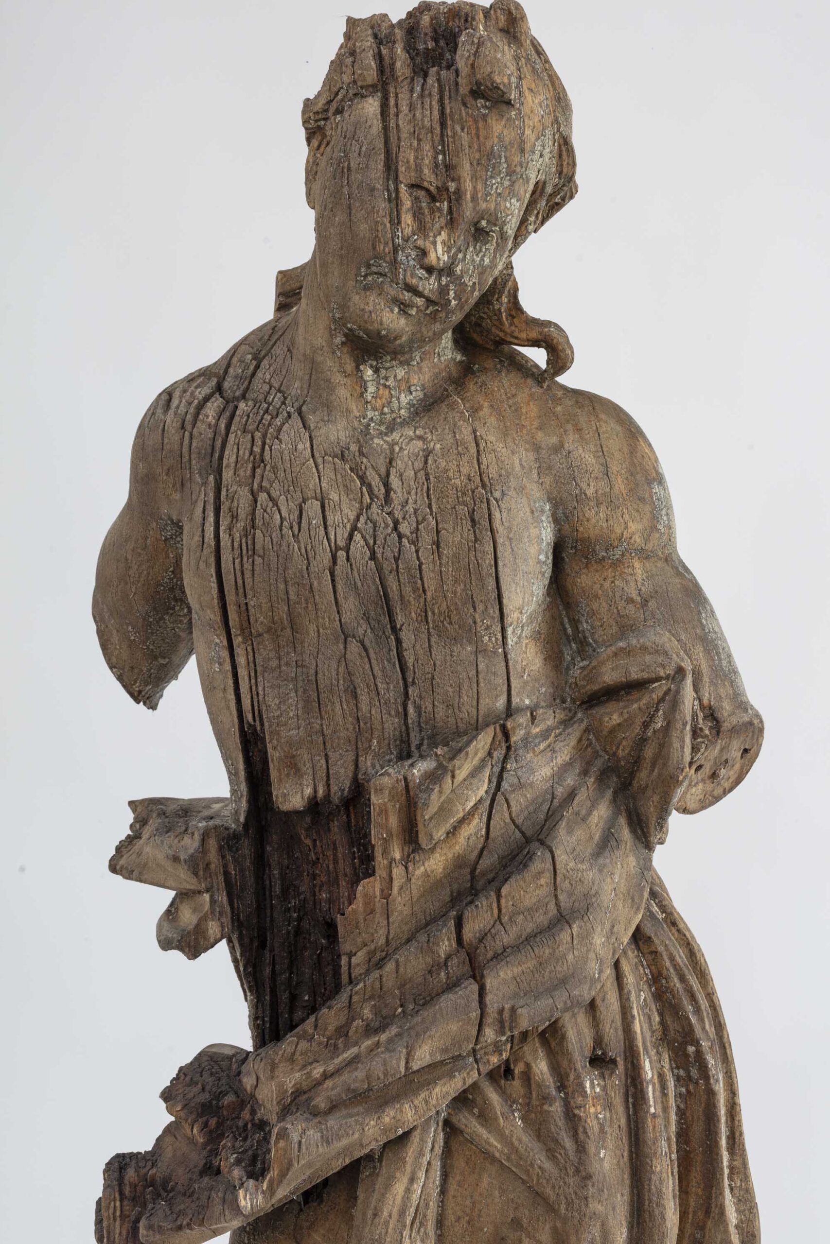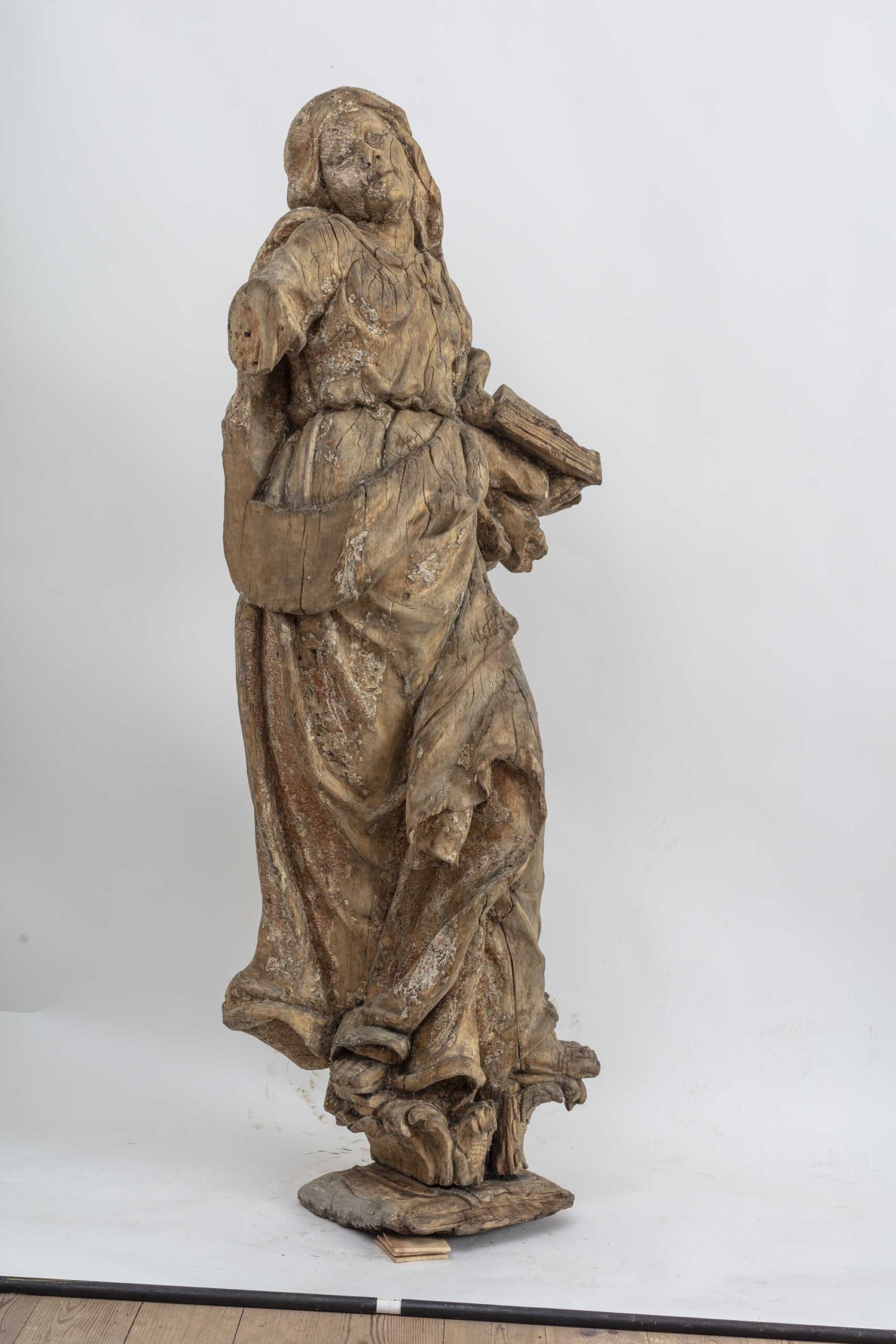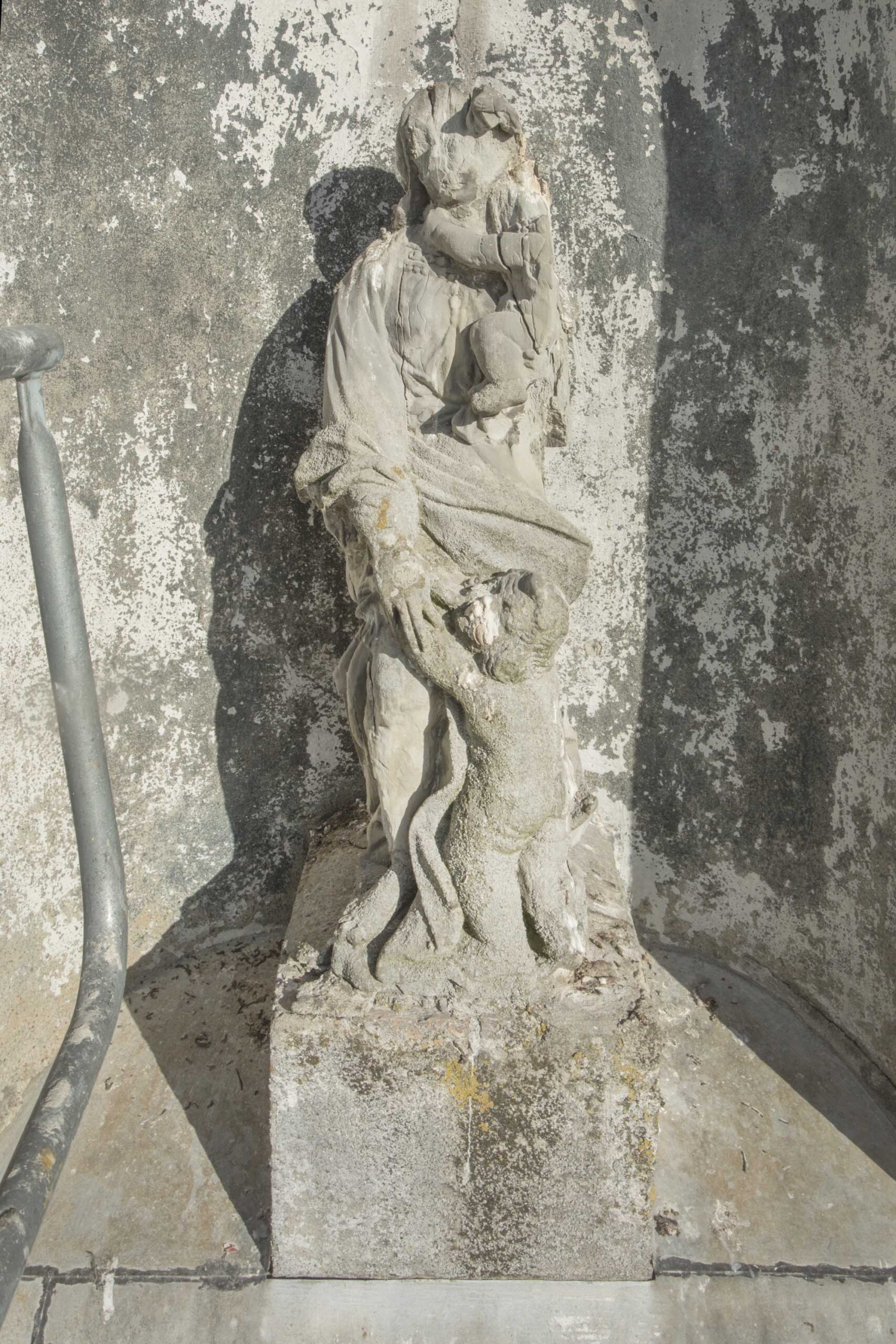 W niszach skromnej fasady świątyni bernardyńskiej zachował się zespół cennych z punktu widzenia historii sztuki i kultury artystycznej Warmii kamiennych i drewnianych figur. W najwyższej wnęce do 2020 r. znajdowała się manierystyczna, odkuta z piaskowca gotlandzkiego Burgsvik figura-personifikacja cnoty teologalnej Caritas (Miłości / Miłosierdzia), ujętej tradycyjnie jako ubrana w antykizującą szatę młoda kobieta z dwójką małych dzieci – starszym stojącym przy nodze i drugim, młodszym, na ręku. Statua ta nawiązuje użytym materiałem i stylem do figur i ornamentów nowo odkrytego ołtarza przegrodowego Matki Bożej i św. Anny sprzed 1626 r., oraz do pary alabastrowych posągów alegorycznych dłuta Abrahama van den Blocke’a z Gdańska w zwieńczeniu marmurowego nagrobka piętrowego Andrzeja i Baltazara Batorych (1598-1602).