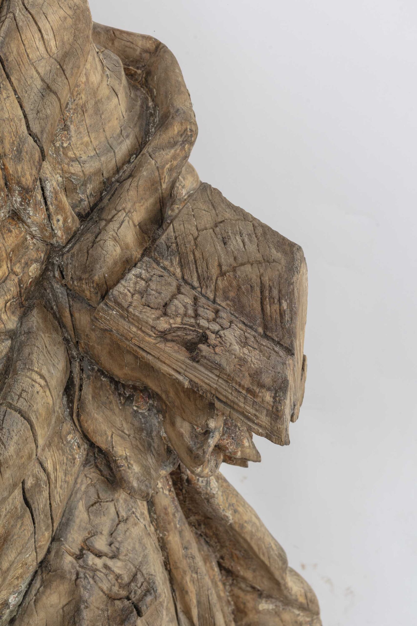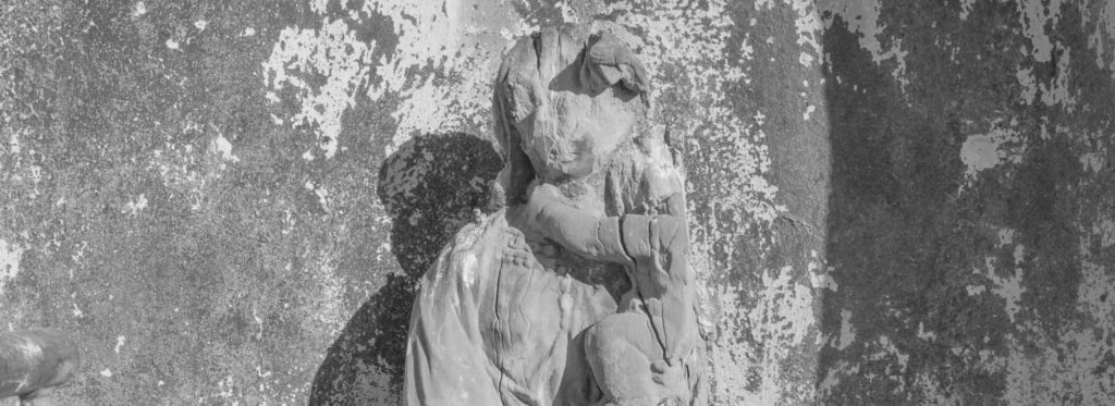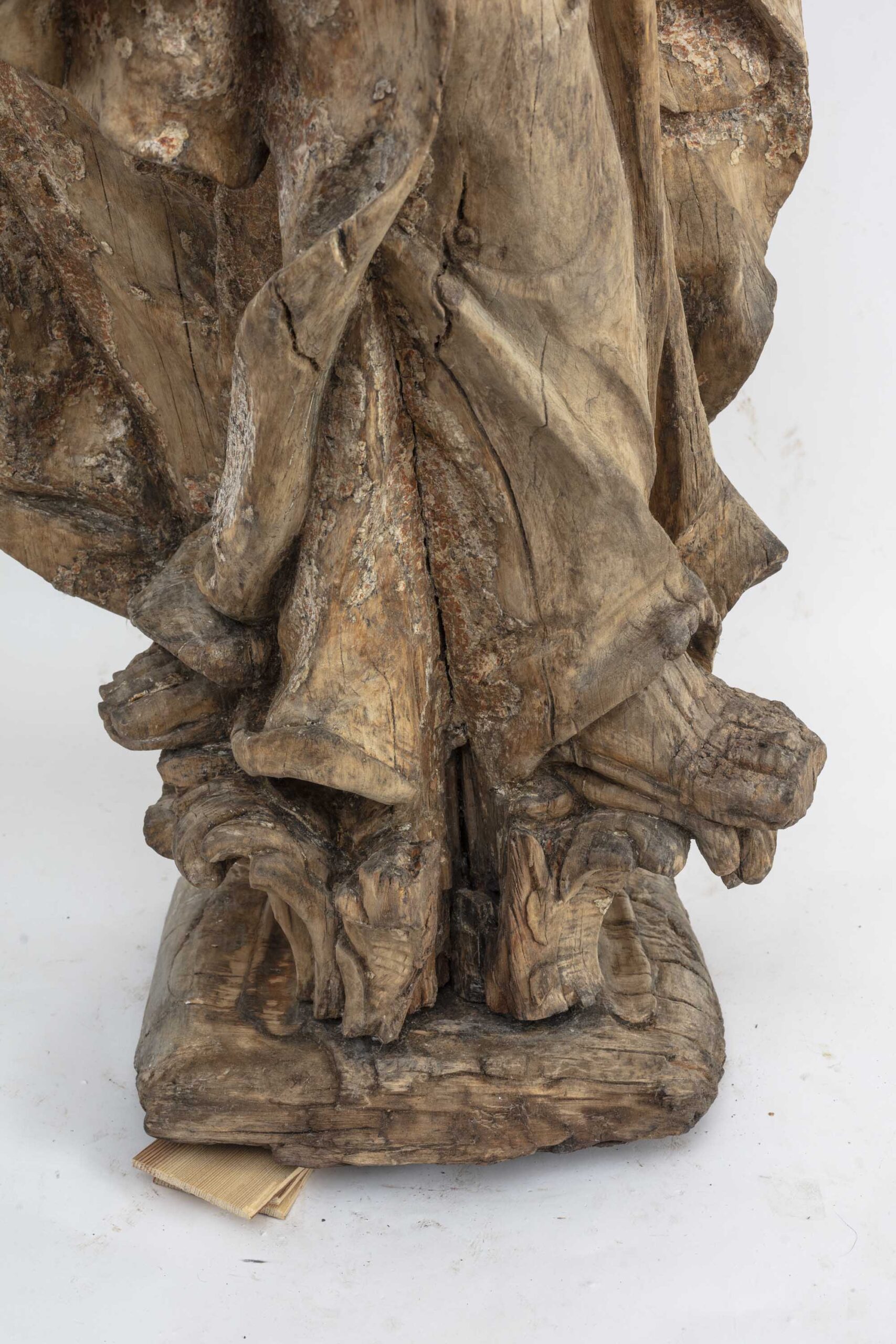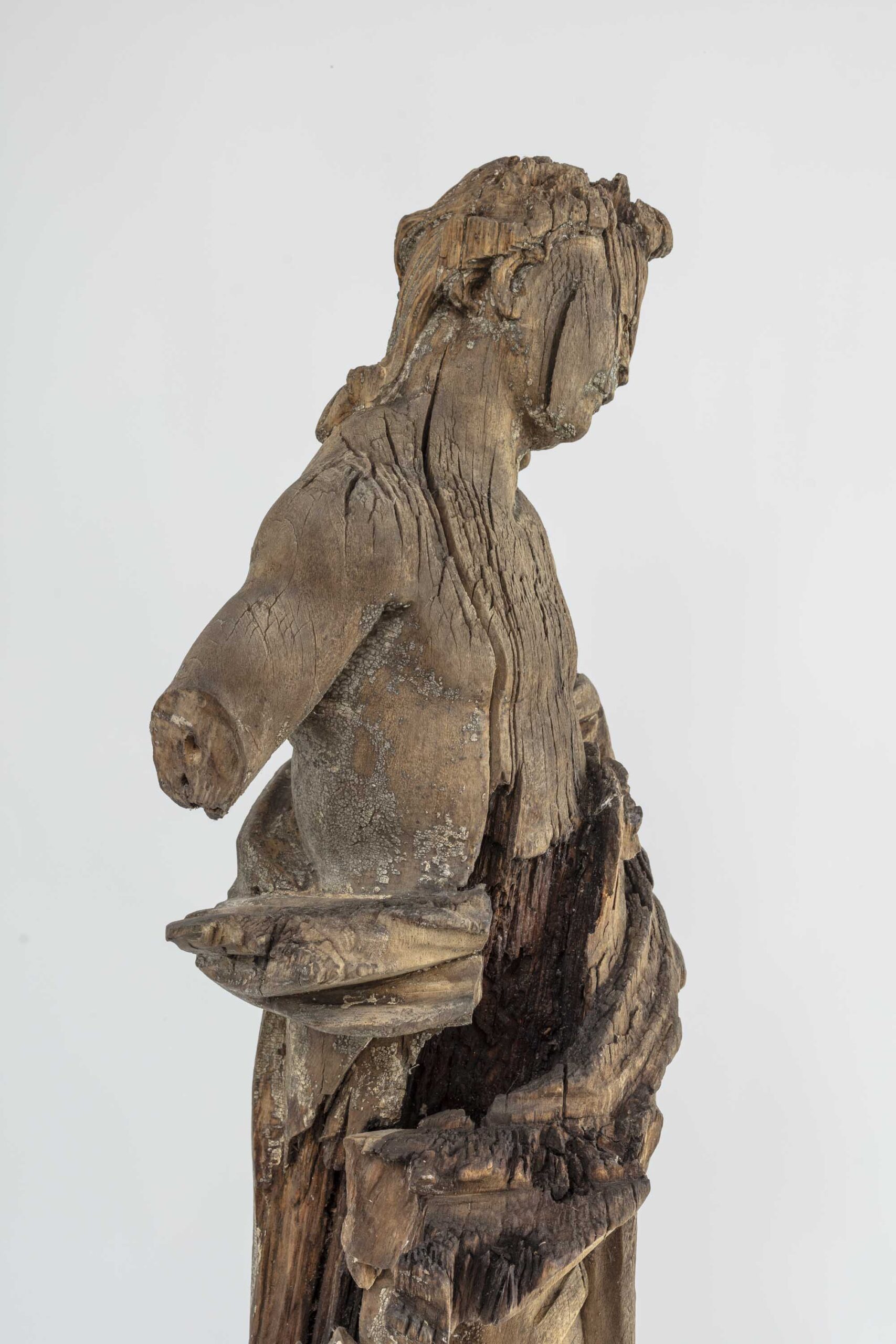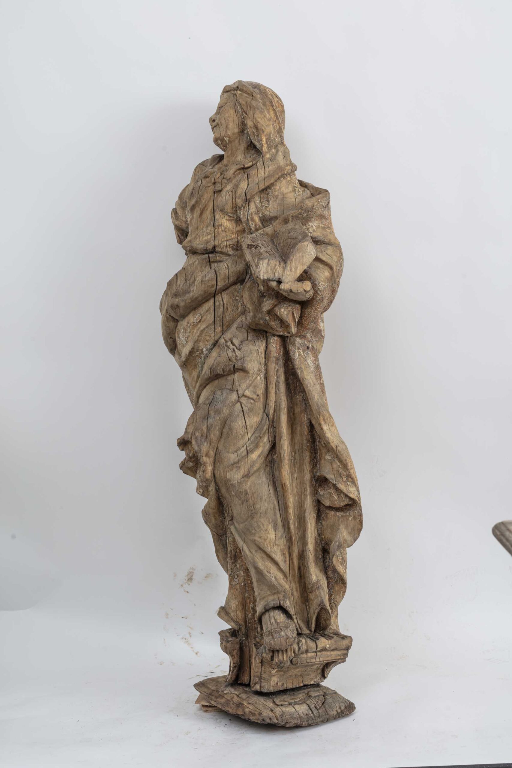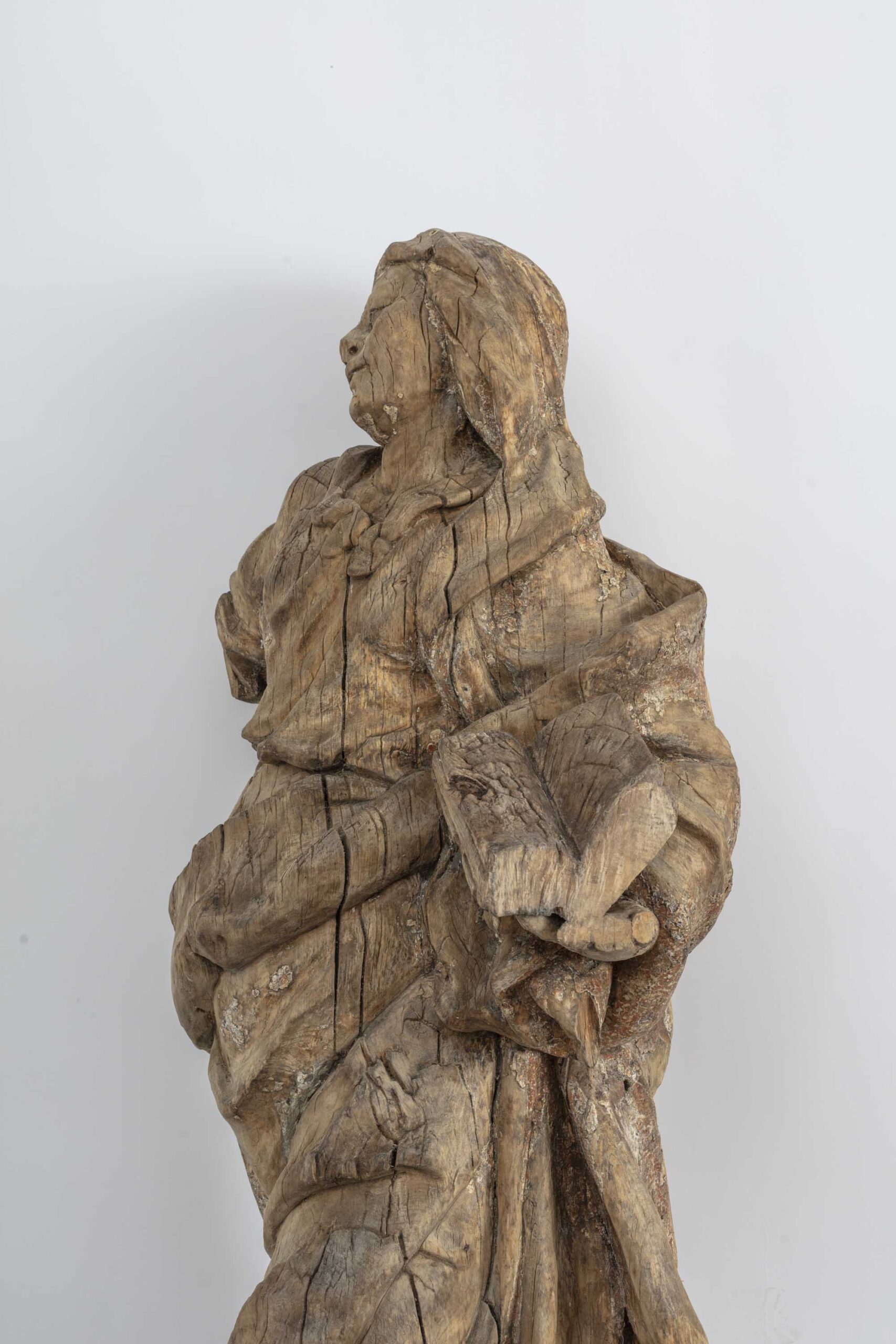 W niszach skromnej fasady świątyni bernardyńskiej zachował się zespół cennych z punktu widzenia historii sztuki i kultury artystycznej Warmii kamiennych i drewnianych figur. W najwyższej wnęce do 2020 r. znajdowała się manierystyczna, odkuta z piaskowca gotlandzkiego Burgsvik figura-personifikacja cnoty teologalnej Caritas (Miłości / Miłosierdzia), ujętej tradycyjnie jako ubrana w antykizującą szatę młoda kobieta z dwójką małych dzieci – starszym stojącym przy nodze i drugim, młodszym, na ręku. Statua ta nawiązuje użytym materiałem i stylem do figur i ornamentów nowo odkrytego ołtarza przegrodowego Matki Bożej i św. Anny sprzed 1626 r., oraz do pary alabastrowych posągów alegorycznych dłuta Abrahama van den Blocke’a z Gdańska w zwieńczeniu marmurowego nagrobka piętrowego Andrzeja i Baltazara Batorych (1598-1602).