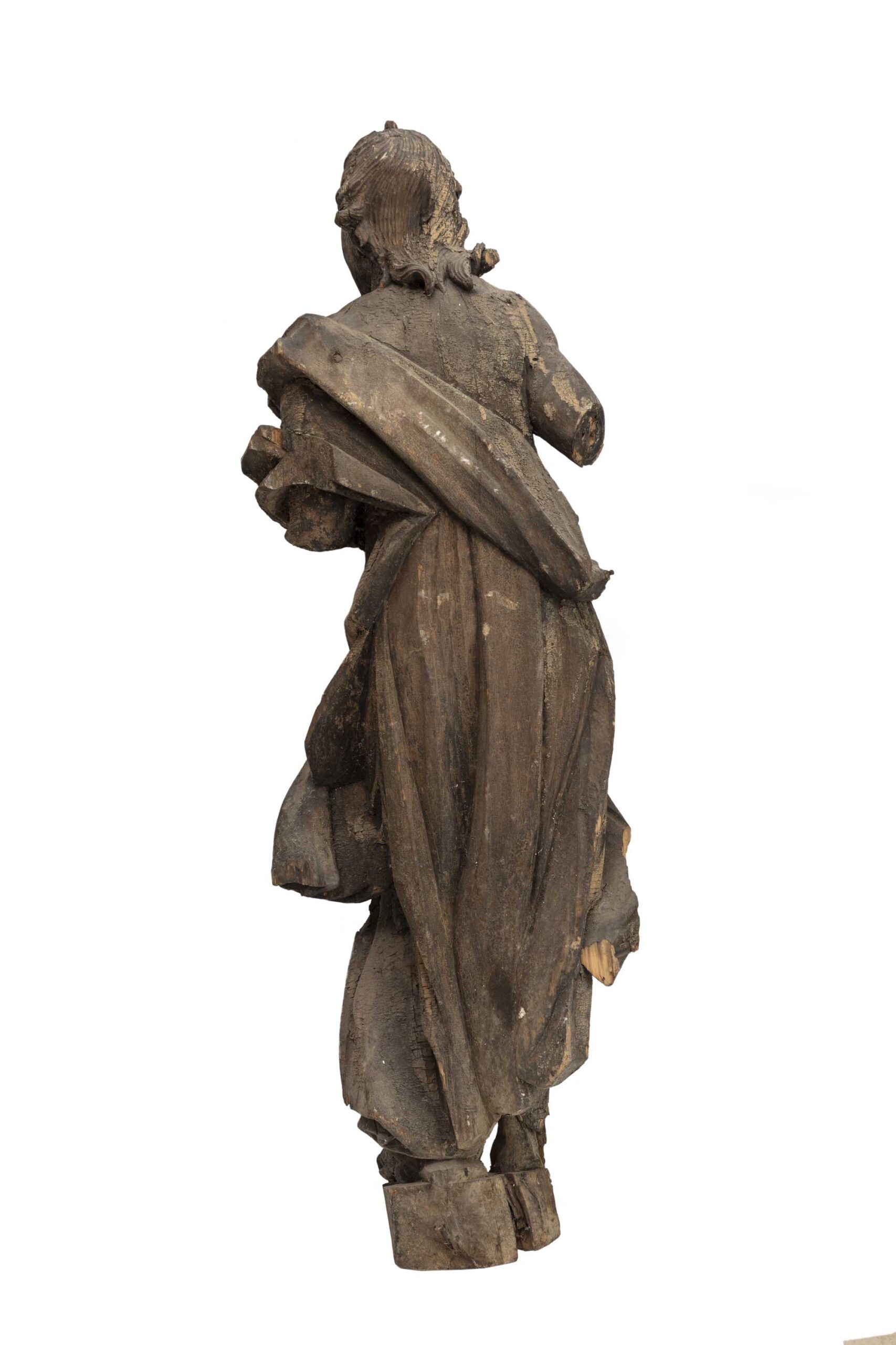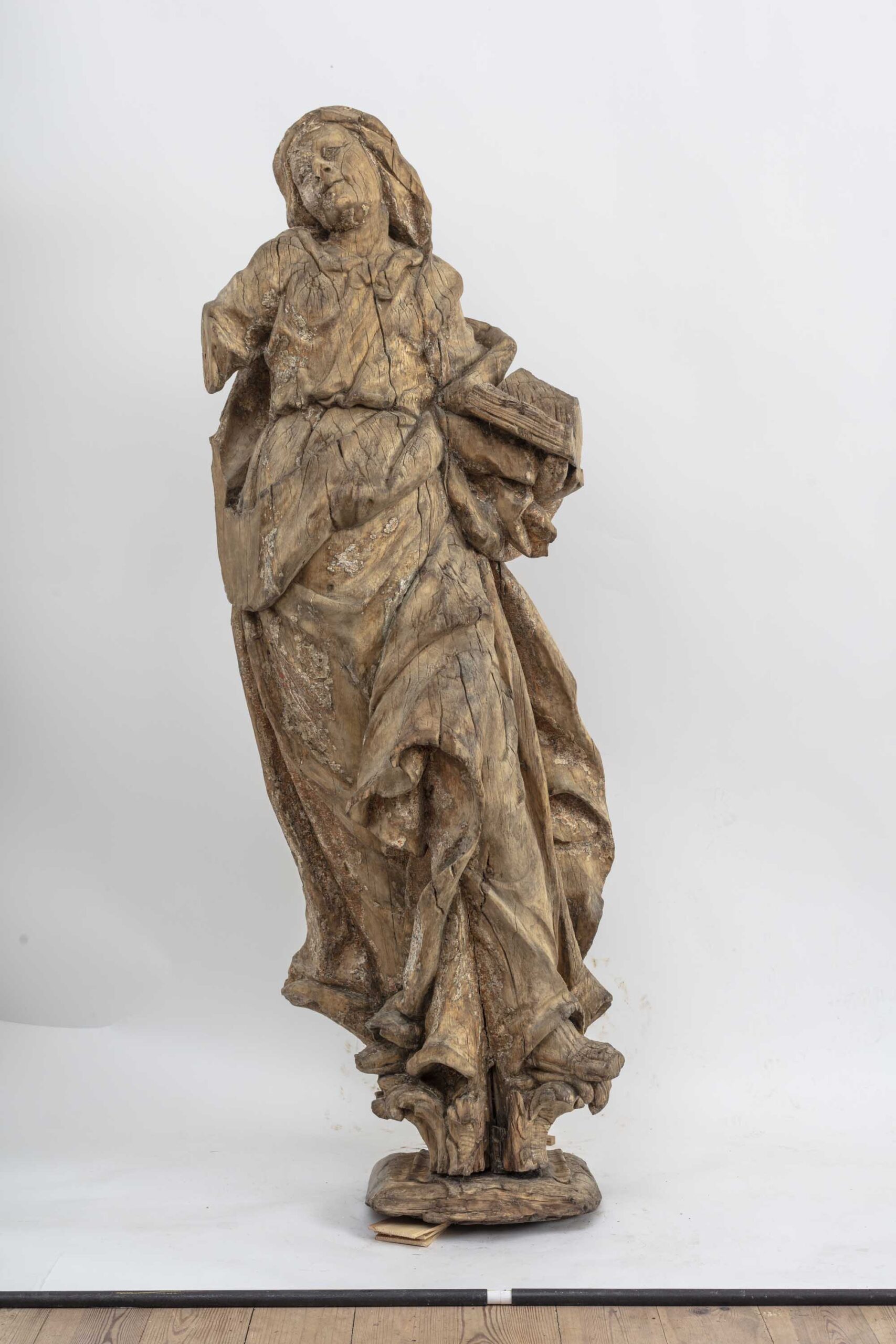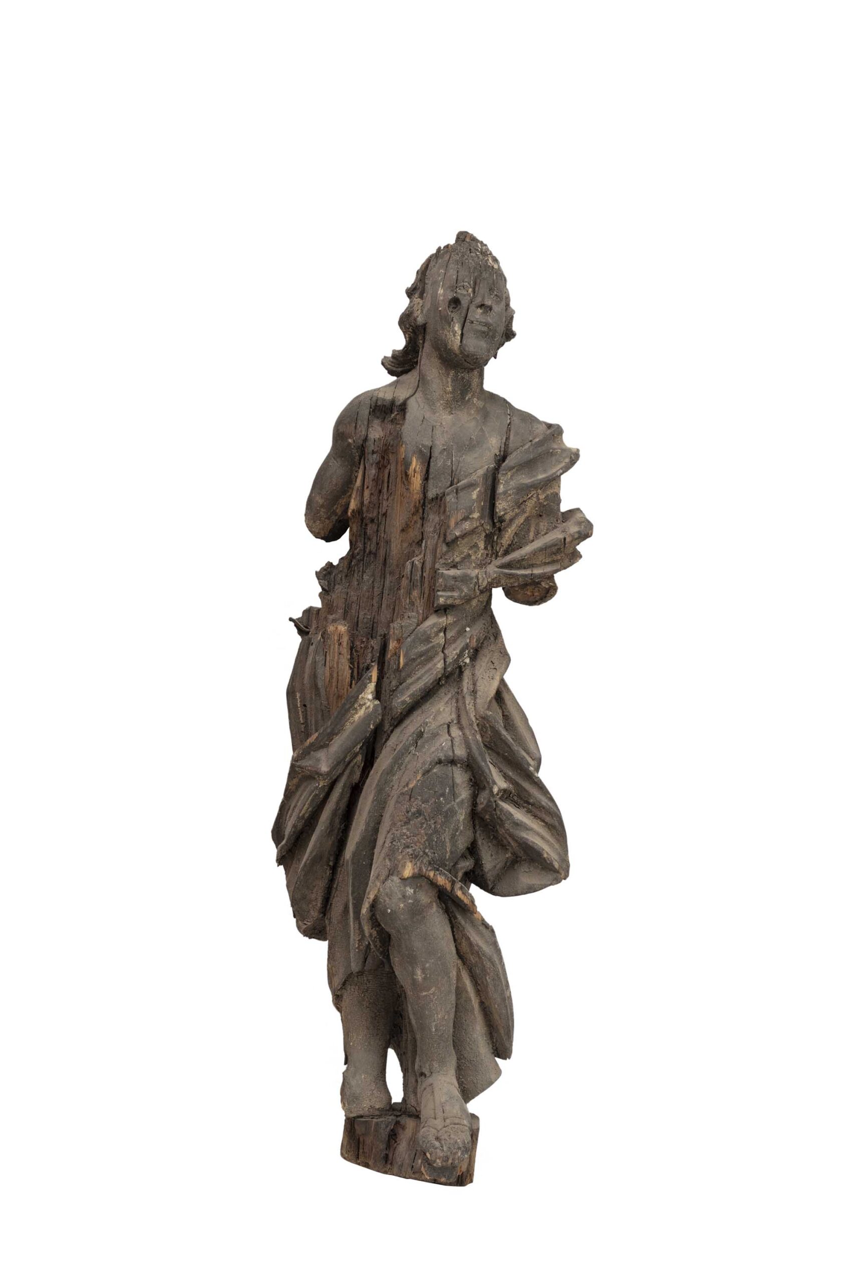 W trzech niższych wnękach zapewne dopiero w XIX w. znalazła się grupa wyciętych w lipinie figur: w środkowej – św. Jan Apostoł z księgą Ewangelii, a w bocznych – anioły ujęte w dynamicznych pozach w prawo, pozbawione jednak wtórnie skrzydeł. Pochodzą one prawdopodobnie z rozebranych w tym okresie późnobarokowych ołtarzy w 4. przęśle nawy, zbudowanych w latach 50. XVIII w. przez reszelski warsztat snycerski Johanna Christiana Bernhadra Schmidta (daty życia: 1734-1784), autora barczewskiej kazalnicy. Stylistycznie i formalnie anioły nawiązują do wczesnej fazy twórczości tego mistrza, i znajdują analogie z kilkoma figurami świętych bernardyńskich i franciszkańskich, zdeponowanymi obecnie w Muzeum Archidiecezji Warmińskiej w Olsztynie. Pozy wymienionych postaci wskazują, że pierwotnie były umieszczone po lewej stronie dwóch różnych nastaw. W figurze św. Jana uwagę zwraca jej umieszczenie na cokole w postaci realistycznie oddanego kielichowego kwiatu o rozchylonych płatkach. Snycerz nawiązał tym do wcześniejszej o stulecie manierystycznej tradycji niderlandzkiej, rozpowszechnionej w krajach nadbałtyckich, m.in. w Królewcu i Prusach Książęcych (Wschodnich).